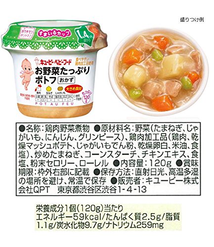 ●【商品説明】●「キユーピーベビーフード すまいるカップ お野菜たっぷりポトフ 1歳4ヵ月頃から」は、やわらかく仕上げた鶏肉とたっぷりの野菜をじっくりと煮込み、具だくさんに仕上げたベビーフード おかずタイプです。●コンパクトで持ち運びやすい容器は、家でも外でもお皿いらず。●電子レンジ加熱OK。●成長に合わせた具材の大きさ・固さ。●素材のうま味をいかした深い味わい。●そのまま食べてもおいしい。●ごはんやパンと一緒にどうぞ。●着色料、保存料、香料不使用。●1歳4ヶ月頃から。●【原材料に含まれるアレルギー物質】●卵、鶏肉●【お召し上がり方】●そのままおいしく召し上がれます。●(1)シールを完全にはがします。●(2)キャップを再びしっかりとはめます。●(3)電子レンジで温めます。●(500-600W:10秒)※オート加熱不可。●(4)よく混ぜてから、あげてください。●【ご注意】●発火・変形を避けるため、お召し上がり方の加熱手順、条件をお守りください。●温めた後に、中身がはねてヤケドをする恐れがありますのでご注意ください。●ヤケドをしないようにお子さま...