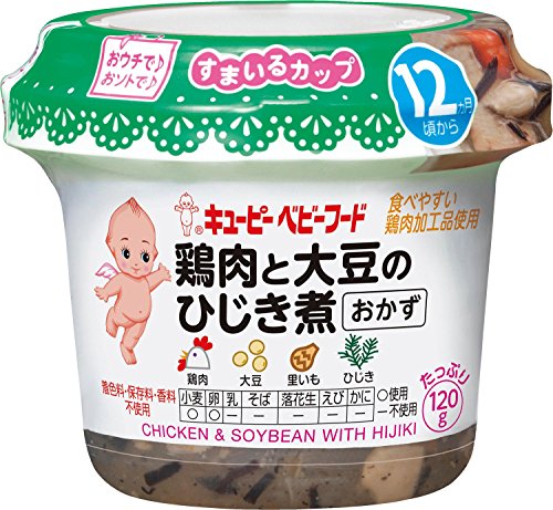 ●【商品説明】●「キユーピーベビーフード すまいるカップ 鶏肉と大豆のひじき煮 12ヵ月頃から」は、やわらかく仕上げた鶏肉、根菜、大豆を、ひじきと一緒に和風だしで煮込んだベビーフード おかずタイプです。●コンパクトで持ち運びやすい容器は、家でも外でもお皿いらず。●電子レンジ加熱OK。●成長に合わせた具材の大きさ・固さ。●だしや素材のうま味をいかした深い味わい。●そのまま食べてもおいしい。●ごはんやパンと一緒にどうぞ。●着色料、保存料、香料不使用。●12ヶ月頃から。●【原材料に含まれるアレルギー物質】●卵、小麦、大豆、鶏肉●【お召し上がり方】●そのままおいしく召し上がれます。●(1)シールを完全にはがします。●(2)キャップを再びしっかりとはめます。●(3)電子レンジで温めます。●(500-600W:10秒)※オート加熱不可。●(4)よく混ぜてから、あげてください。●【ご注意】●発火・変形を避けるため、お召し上がり方の加熱手順、条件をお守りください。●温めた後に、中身がはねてヤケドをする恐れがありますのでご注意ください。●ヤケドをしないようにお...
