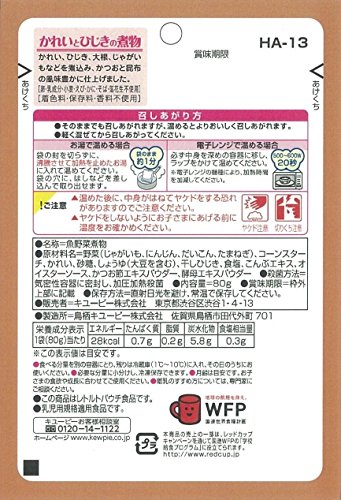 - 原材料:野菜(じゃがいも、にんじん、だいこん、たまねぎ)、コーンスターチ、かれい、砂糖、しょうゆ(大豆を含む)、干しひじき、食塩、こんぶエキス、オイスターソース、かつお節エキスパウダー、酵母エキスパウダー