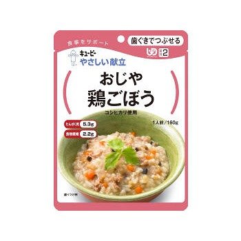 「やさしい献立おじや鶏ごぼう160g」は、刻み・やわらか食です。鶏肉やごぼうが味わい深い、炊き込みご飯風のおじやです。