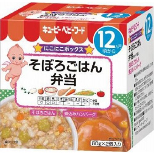 ●【商品説明】●「キユーピー にこにこボックス そぼろごはん弁当 60g×2個入り 12ヶ月頃から」は、そぼろごはんと煮込みハンバーグのベビーフードセットです。●鶏肉、卵のそぼろ、野菜などを昆布だしで炊き上げたごはんと、野菜たっぷりのトマトソースで煮込んだ鶏肉のハンバーグのセットです。●素材の風味をいかし、うす味に仕上げています。●月齢に合わせた大きさや固さに調整しています。●温めずに、そのままでもおいしく召しあがれますので、お出かけ時にも便利で、赤ちゃんの笑顔も広がります。●賞味期限等の表記について西暦年/月/日の順番でパッケージに記載。●【お召し上がり方】●温めずに、そのままでもおいしく召しあがれます。●よくかき混ぜてからあげてください。●○お湯で温める場合ふたをはがさずに、容器のままお湯に約2分-3分つけてください。●沸騰はさせないでください。●○電子レンジで温める場合(1)容器のふたを完全にとりのぞいてください。●(2)耐熱容器(金箔などの金属塗料が使われていないもの)に移しかえ、ラップをかけて電子レンジで温めてください。●※加熱時間の目安は、出力5...