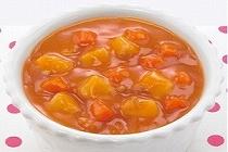 小麦・卵・乳・そば・落花生・えび・かにを使わずに作りました。鶏レバー、じゃがいも、にんじんなどをじっくり煮込み、トマトの風味豊かに仕上げました。