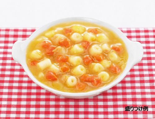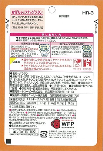 - 原材料:野菜(かぼちゃ、にんじん)、マカロニ(小麦を含む)、コーンスターチ、まぐろ水煮、チキンエキス(還元水あめ、チキンエキス、食塩、でん粉、酵母エキス、デキストリン)、炒めたまねぎ、砂糖、全粒粉、食塩