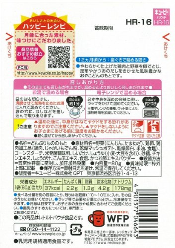 - 原材料:野菜(にんじん、たまねぎ)、鶏卵、鶏肉加工品(鶏肉、じゃがいもでん粉、乾燥マッシュポテト、乾燥卵白、米油、食塩)、コーンスターチ、米発酵調味料、しいたけ、しょうゆ(小麦・大豆を含む)、砂糖、チキンエキス、しょうが汁、こんぶエキス、食塩、かつお節エキスパウダー