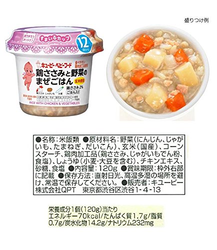 ●【商品説明】●「キユーピーベビーフード 鶏ささみと野菜のまぜごはん 120g 12ヵ月頃から」は、食べやすくした鶏ささみ、にんじん、大根などを鶏肉のうま味と一緒に炊き込んだ玄米のベビーフード ごはん類(12ヶ月頃から)です。●【原材料に含まれるアレルギー物質】●小麦・大豆・鶏肉●【お召し上がり方】●1.キャップをはずします。●2.シールを完全にはがします。●3.再びしっかりとキャップをしめます。●4.電子レンジであたためます。●※500W-600W約10秒を加熱5.よく混ぜ、温度を確かめてからあげてください。●【ご注意】●発火・変形を避けるため上記加熱手順、条件をお守りください。●温めた後に、中身がはねてヤケドをする恐れがありますのでご注意ください。●ヤケドをしないようにお子さまにあげる前に温度をお確かめください。●(内フタ記載)オート加熱不可マーク●【保存方法】●直射日光、高温多湿の場所を避け、常温で保存してください。●【原材料名・栄養成分等】●名称・品名:米飯類●原材料:野菜(にんじん、じゃがいも、たまねぎ、だいこん)、玄米(国産)、コーンス...
