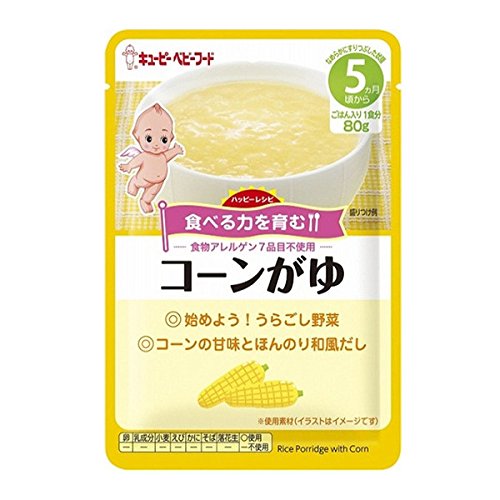 「キユーピーベビーフード ハッピーレシピ コーンがゆ 80g 5ヶ月頃から」は、小麦・卵・乳・そば・落花生・えび・かにを使わずに作られたベビーフード ごはん類(9ヶ月頃から)です。コーン本来の甘味をいかし、ほんのり和風だしをきかせたやさしい味わいです。月齢に合わせた「素材選び」と「具材の大きさ・固さ」で食べる力を育てます。だしの使い方を工夫して塩分控えめに、素材のうま味を引き出した深い味わいです。赤ちゃんの味覚形成をサポートします。自分の家族に作る気持ちで、こだわりを持って作られています。