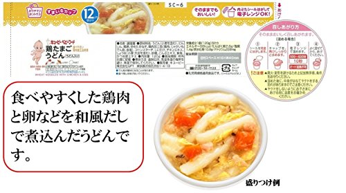 ●【商品説明】●「キユーピーベビーフード 鶏たまごうどん 120g 12ヵ月頃から」は、食べやすくした鶏肉と卵などを和風だしで煮込んだベビーフード うどん等麺類(1歳頃から)です。●【原材料に含まれるアレルギー物質】●卵・小麦・大豆・鶏肉●【お召し上がり方】●1.キャップをはずします。●2.シールを完全にはがします。●3.再びしっかりとキャップをしめます。●4.電子レンジであたためます。●※500W-600W約10秒を加熱5.よく混ぜ、温度を確かめてからあげてください。●【ご注意】●発火・変形を避けるため上記加熱手順、条件をお守りください。●温めた後に、中身がはねてヤケドをする恐れがありますのでご注意ください。●ヤケドをしないようにお子さまにあげる前に温度をお確かめください。●(内フタ記載)オート加熱不可マーク●【保存方法】●直射日光、高温多湿の場所を避け、常温で保存してください。●【原材料名・栄養成分等】●名称・品名:調理麺●原材料:うどん(小麦を含む)、にんじん、鶏卵、炒めたまねぎ、鶏肉加工品(鶏肉、じゃがいもでん粉、食塩)、コーンスターチ、し...