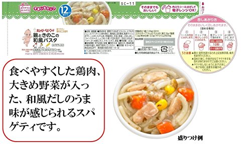 ●【商品説明】●「キユーピーベビーフード 鶏ときのこの和風パスタ 120g 12ヵ月頃から」は、食べやすくした鶏肉、大きめ野菜が入った、和風だしのうま味が感じられるベビーフード パスタ類(1歳頃から)です。●【原材料に含まれるアレルギー物質】●卵・乳成分・小麦・大豆・鶏肉●【お召し上がり方】●1.キャップをはずします。●2.シールを完全にはがします。●3.再びしっかりとキャップをしめます。●4.電子レンジであたためます。●※500W-600W約10秒を加熱5.よく混ぜ、温度を確かめてからあげてください。●【ご注意】●発火・変形を避けるため上記加熱手順、条件をお守りください。●温めた後に、中身がはねてヤケドをする恐れがありますのでご注意ください。●ヤケドをしないようにお子さまにあげる前に温度をお確かめください。●(内フタ記載)オート加熱不可マーク●【保存方法】●直射日光、高温多湿の場所を避け、常温で保存してください。●【原材料名・栄養成分等】●名称・品名:調理麺●原材料:野菜(たまねぎ、にんじん、とうもろこし)、スパゲッティ(小麦を含む)、鶏肉加工品...