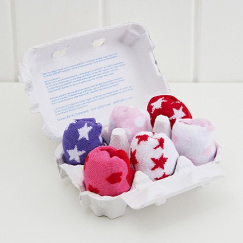たまご容器のようなパッケージを開けるとくつ下が6足。POPでカラフルなセットです。たまご容器のようなパッケージの中に、くつ下が6足入っています。本物のたまごみたいにくつ下をコロンと丸めて入れてあります。POPな柄と元気のでるビタミンカラーで、いろんな洋服に合わせやすいデザインです。 男の子が好きな配色のセットです。