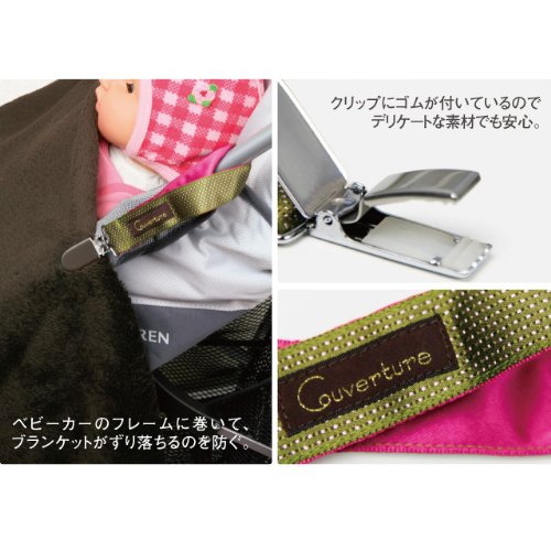 Couverture(クウベルチュール)のbonbon ブランケットホルダーは、ベビーカーに掛けたブランケットがずり落ちるのを大きめのクリップで防ぐ寒い季節に心強い便利なアイテム。他のブランドとはひと味ちがった大人っぽいリッチな質感で、お気に入りのベビーカーとブランケットと合わせてお出かけするのが楽しくなりそう!