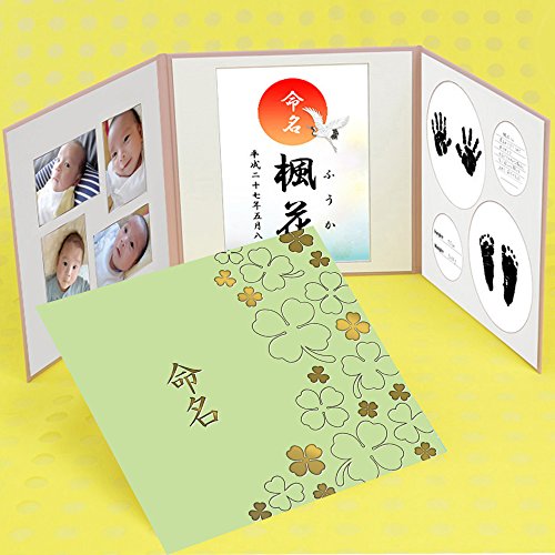 手形足形命名書 クローバ柄 若草色「命名」ゴールド箔 命名書台紙 【手形・足形・名前・写真】赤ちゃん命名書台紙 赤ちゃんの手形・足形・写真・お名前がすべて入る!命名台紙 命名紙 フォトアルバム 出産祝い ギフト 名づけ (若草色)