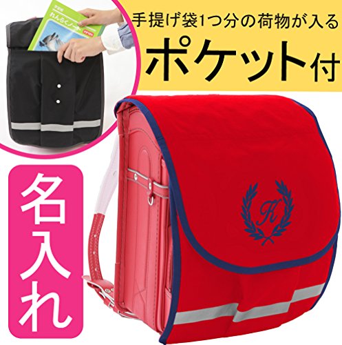 ランドセルカバー ポケット付き【ポケランカバー】葉【赤生地×ネイビーふち×紺刺繍】オリジナル内・外ポケット付き 手ぶら 通学 登校 撥水 防キズ 名入れ 女の子 日本製 オリジナル 汚れやキズ、雨からランドセルをまもるちゃんとみえる沢山入る 当社発! 内外ポケットつきランドセルカバーで手ぶら登校!!反射テープつき 撥水素材使用 (サイズ大)