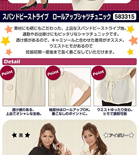 妊娠中だって、オシャレを楽しみたい。素材にも柄にもこだわった、上品なスパンドビーストライプ地のシャツチュニック。透け感があるので、キャミソールと合わせた着用がオススメです。