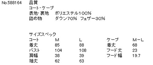 品質 コート・ケープ 表地・裏地 ポリエステル100% 詰め物 ダウン70% フェザー30% サイズスペック コート M L ケープ M-L 着丈 85 88 着丈 68 バスト 104 108 フード丈 23 肩幅 38 39 フード幅 19.7 袖丈 62 63