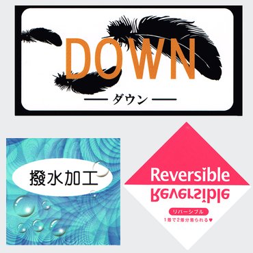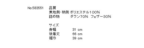 品質 無地側・柄側 ポリエステル100% 詰め物 ダウン70% フェザー30% サイズスペック 身幅 31 後着丈 66 裾巾 39