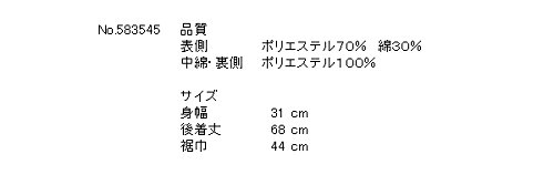 品質 表側 ポリエステル70% 綿30% 中綿・裏側 ポリエステル100% サイズスペック 身幅 31 後着丈 68 裾巾 44