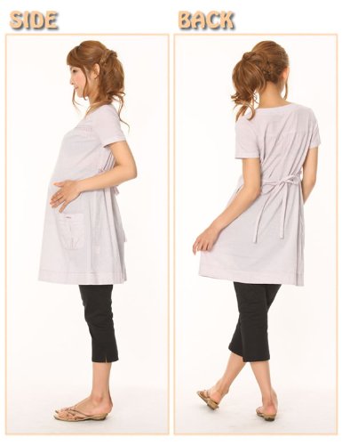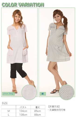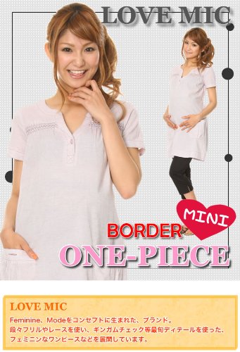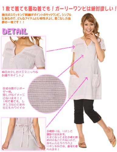 胸元の刺繍がチャームポイントの、ミニワンピ。細かいボーダー柄がとっても涼しげです。お腹周りの大きさはリボンで調節できるので、お腹の赤ちゃんもラクチンです!