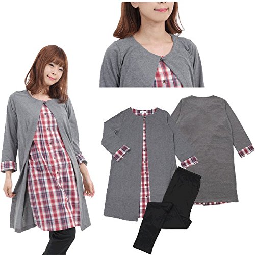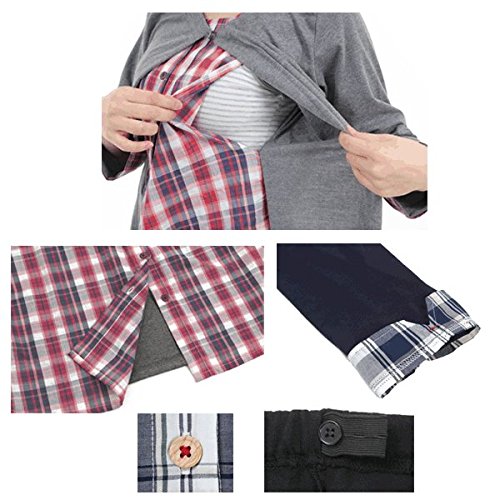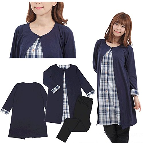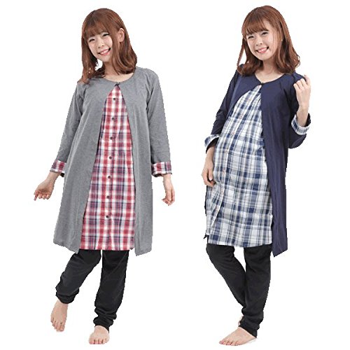 クロスプラス 春夏 マタニティ チェック レイヤード風 長袖パジャマ(授乳口付)産前・産後 (M, 紺)