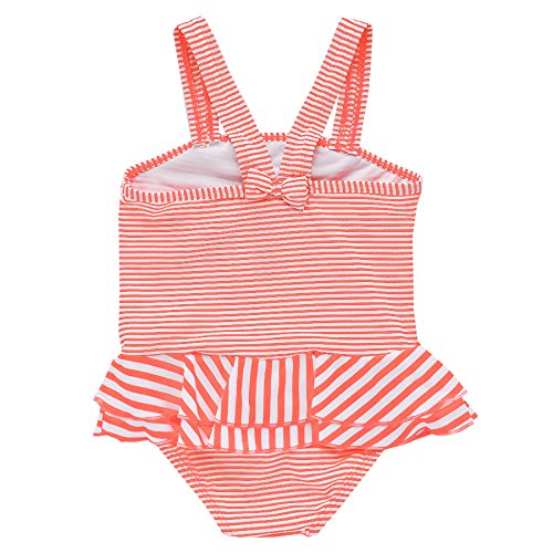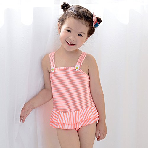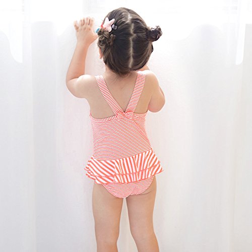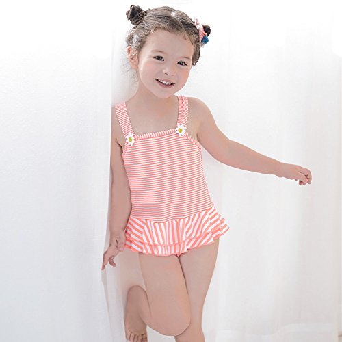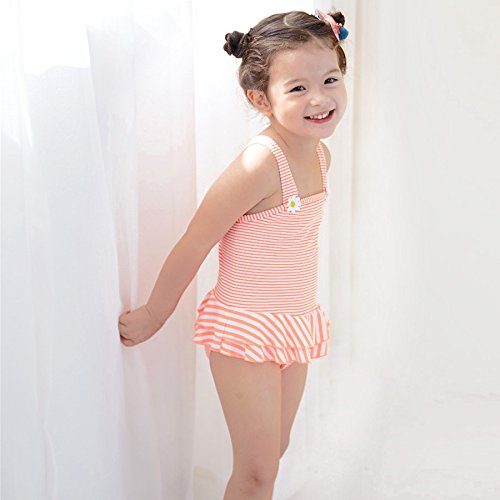 Girls お花モチーフ付きボーダー柄ワンピース水着 UPF50+ (120/オレンジ) 【CN-SW020】 子供用 女の子 スイムウエア