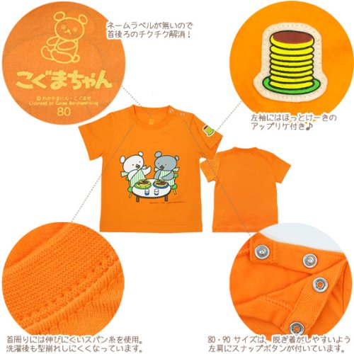こぐまちゃんとしろくまちゃんが仲良くほっとけーきを食べる人気のイラストがTシャツになりました♪ 衿ぐりのネームタグを無くし、首の後ろのチクチク解消。80・90サイズは着脱がしやすいように、左肩にスナップボタンを付けました。みんなでお揃いにしたり、カラバリを楽しんでくださいね♪ 【ご注意】色落ちや移染を防ぐため、他の物と分けて単品で洗濯して下さい。漂白剤入りの洗剤やタンブラー乾燥は避けて下さい。湿った状態で長時間重ね合わせると移染することがありますので、洗濯後は形を整え、直射日光を避け陰干しして下さい。プリント部分にはアイロンをかけないでください。