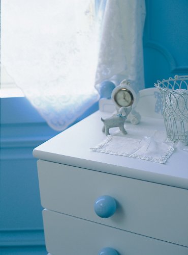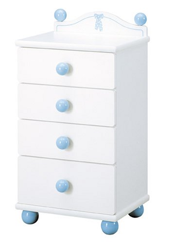 丸くて大きなブルーの持ち手がやさしい印象のホワイトベースのミニサイドチェスト。狭い場所でもすっきり置けるコンパクトサイズ。着替えやオムツ、バスタオルなど細かいものからかさばるものまでまとめて収納できる。