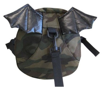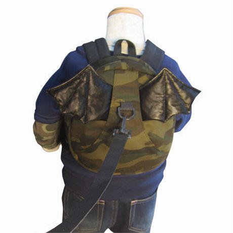 ★迷彩柄に羽がついた迷子ひも付きリュックです。