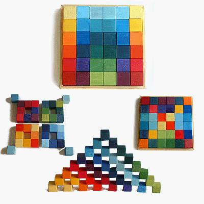 - 2個づつ18色の立方体です。並べるとすてきな模様が現れます。