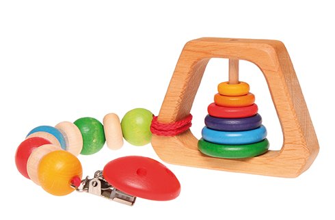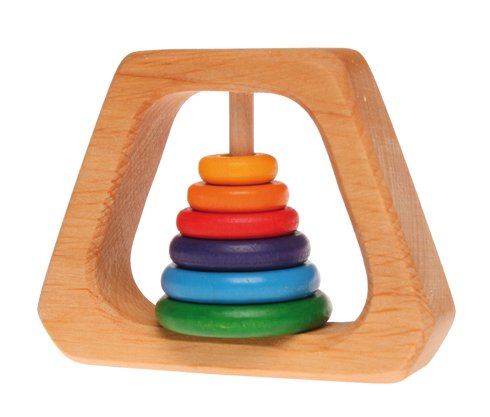 6色のレインボーカラーのリングがついた木製ラトル。素材はカエデ。オイル塗装仕上のシンプルなラトルです。