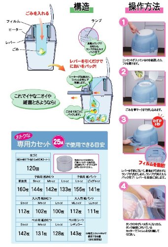 ●ごみをポイッと入れてパック!ニオイと雑菌を抑えて衛生的な快適生活を●フタを開け、ゴミを入れ、ハンドルを引けば、お知らせサインで約3秒で パック完了●ゴミを入れ、専用フィルムをヒーターの熱でパックするので、においを もれにくくします●レジ袋をセットして、いっぱいになったら手を汚さず清潔にゴミ箱へ 捨てられます。(ゆとりの内容量 約20L)●長さ25mのフィルムを使用しているので、たっぷり処理できて、 経済的です●幼児用 紙おむつ(育児)や大人用 紙おむつ(介護)また、ペット用等の においが気になる用途に幅広くお使いいただけます●専用カセットは25mあるので、子供用の紙おむつで 約142~160回をパックできます●〈製品仕様〉●(材質)本体:ポリプロピレン(抗菌仕様) カセット(本体):ポリプロピレン(抗菌仕様) カセット(フィルム):ポリエチレン●(電源)AC100V105W(50-60Hz)●電気代:年間約3円(1日に10回使用した場合)●(電源コード)約1.8m●(容器容量)約20L●(耐熱温度)120℃●(耐寒温度)-30℃●(カセッ...