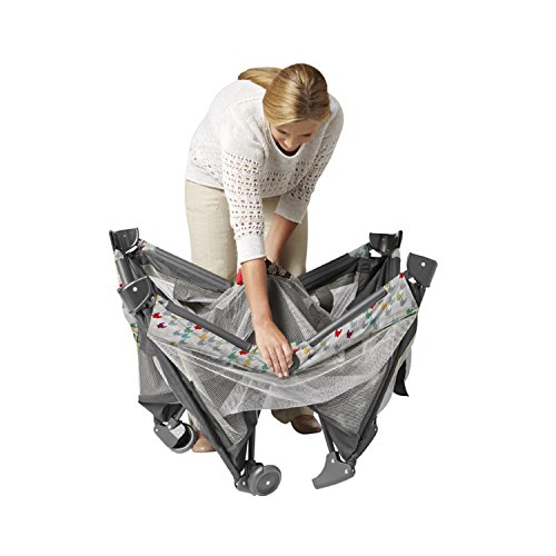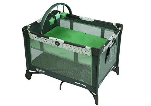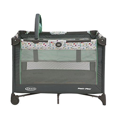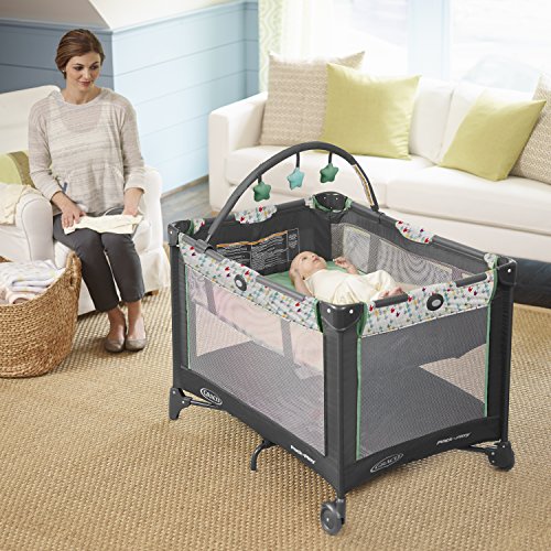 Bassinet designed to fold with your Pack and Play playard for quick set-up and take-down, Folding feet and wheels allow for a 20% more compact fold than the average playard, making it easy to store and to carry, Removable, full-size bassinet provides the perfect spot for baby to catch a nap, at home and away, Toy bar features soft toys to amuse your little one, Signature Graco push-button fold makes closing your playard quick and hassle-free