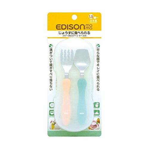 「エジソンのフォーク&スプーン ケース付 パステル(オレンジ・グリーン)」は、子供の手に持ちやすいデザインで、じょうずに食べられるベビー用フォークとベビー用スプーンのセットです。フォークには溝が付いているので、麺がすべり落ちにくく食べやすくなっています。スプーンは先端が平らになっているので、ヨーグルトやプレートご飯などがきれいにすくえるようになっています。また深めの形状で、スープ類にもお使いいただけます。ケース付きなので持ち運びに便利です。