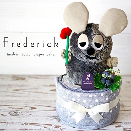 出産祝い 用の おむつケーキ です。ギフト に安心の、ワンランク上の プレミアムパンパース「はじめての肌へのいちばん」Sサイズ(パンパースは産婦人科使用率No.1)使用。 人気絵本作家、レオ・レオニの絵本に登場する「フレデリック」のおもちゃでできた おむつケーキ です。 高品質のアートフラワーが、お祝いムードを盛り上げてくれます。 また、タオルは日本最大の生産地である今治産で、今治ブランド認証された吸水性抜群のコンパクトバスタオルが2枚付いていて、子育てにはもちろんいろんなシーンで活躍してくれます。 紙おむつは透明のフィルムで包装されていますので、衛生的です。 一番小さい「新生児サイズ」ではなく、「Sサイズ」で作ってありますので、赤ちゃんがハイハイを始めるころまでは、おむつケーキをしばらく飾っておくことができます。 ※受け取った方が分かりやすいよう、ラッピングの外側に紙おむつのサイズが書かれたシールが貼付されております。