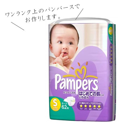 ワンランク上のパンパース・はじめての肌へのいちばん・Sサイズ(パンパースは産婦人科使用率No.1)を使用。布絵本はどのページもおもいっきりカラフル!赤ちゃんのインスピレーションを刺激し、感性を磨いてくれることうけあいです。仕掛けが多く、デザインも優れている逸品です☆ また、ウェディングでも使われている、高品質のアートフラワーが、お祝いムードを盛り上げてくれます。 おもちゃの安全基準としては、最も厳しいとされているCEをクリアしていますので安心してご利用になれます。 また、紙おむつは透明のフィルムで包装されていますので、衛生的です。 一番小さい「新生児サイズ」ではなく、「Sサイズ」で作ってありますので、赤ちゃんがハイハイを始めるころまでは、おむつケーキをしばらく飾っておくことができます。受け取った方が分かりやすいよう、ラッピングの外側に紙おむつのサイズが書かれたシールが貼付されております。 ※おむつケーキは箱ラッピングできません。あらかじめご了承ください。 ※当店では明細書の発行は行っておりません。(アマゾンのご注文履歴ページより「領収書/購入明細書」の印刷が可能です)