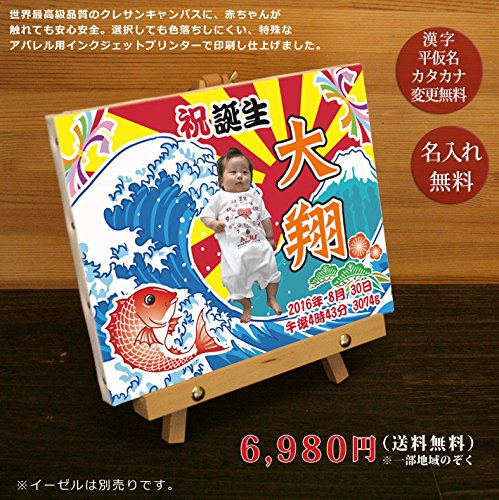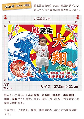 - 絵画用キャンバスに赤ちゃんのお写真、名前、誕生日、出生時間、体重、身長などをプリントした大漁旗デザインのメモリアルキャンバスです。