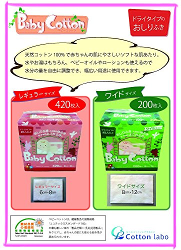 大判ドライタイプのコットンです。繊維製品の国際規格「エコテックススタンダード100」の最も厳しい条件「製品分類I(乳幼児用製品)」をクリアし、赤ちゃんの肌に使える安全性が認められています。国内一貫生産です。お肌にやさしいソフトな肌あたりで、毛羽立ちにくくお肌に繊維が残りにくい。衛生、医療用などに使われている脱脂綿を使用し、原料にこだわっています。赤ちゃんのおしり、首、手首等の汚れ拭きに。赤ちゃんの入浴後の体ふきに。