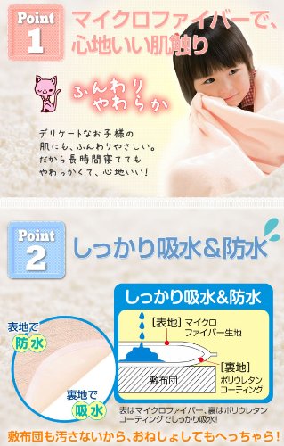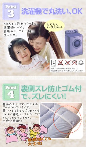 ●布団を汚さず快適!デリケートなお子様の肌にもふんわりやさしい。だから長時間寝ていてもやわらかくて、心地いい!表はマイクロファイバー、裏はポリウレタンコーティングでしっかり吸水。敷布団も汚さないから、おねしょをしてもへっちゃら!おねしょで汚れたシートは、洗濯機にポイ。普通のシーツと一緒に洗える。裏側には上下にズレ防止のゴムがついているので、寝ているときでもずれにくい!いっぱい寝返りしてもシーツがくしゃっとなることなく一晩中快適に寝ることができる
