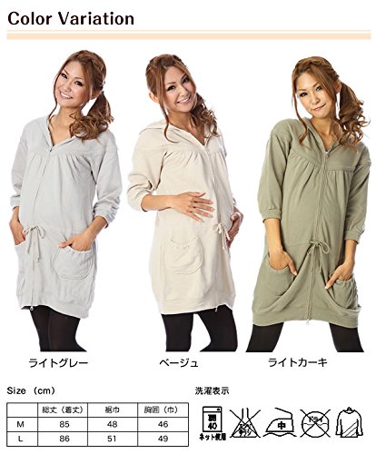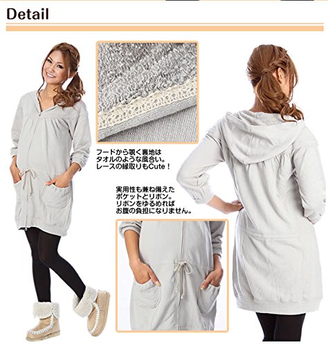 重ね着もキマる七分袖のロングパーカー。フードから覗く裏地はタオルのような風合い、縁取りにレースを使っているのも可愛いですよ。ポケットの形やリボンもポイント。産前産後対応です。サイズ/M、L 製造国/中国