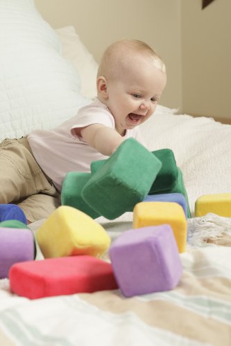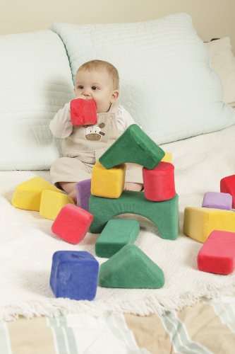 柔らかな素材を使用したブロック。鮮やかな色遣いのブロックが24ピース入っている。形も円柱、三角、四角など変化に富んでいるので、のりものや建物など工夫次第でいろいろなアレンジが可能。
