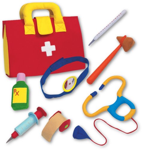 お医者さんごっこにぴったりの布製キット。聴診器の先の部分を押すと音が出る。紐の長さは子どもが誤って首に巻かないように計算されて作られているので安心。薬のふたも飲み込まないように紐で止めてある。包帯は取り外しができ、腕に巻くことができる。バックは組み立て式(実際のバックの色は白地に赤の十字)。