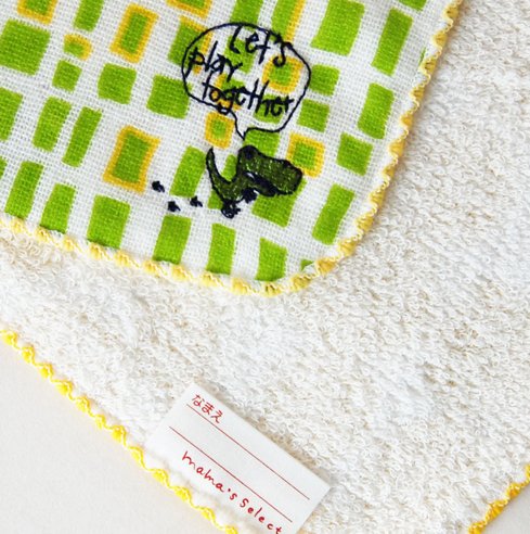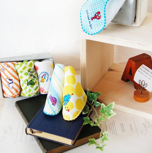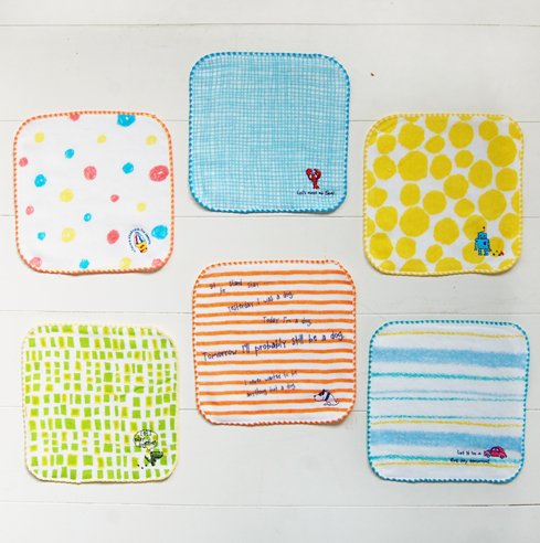 クレヨンやマジックで書いたような手書き風プリントに、可愛らしい刺繍がアクセントになった楽しいシリーズです。 表はガーゼ、裏がパイルのガーゼ&パイルタオルで、表のガーゼ部分には、起毛加工を施しているので、ふんわりやさしい肌触りになりました。 ハンカチの16×16cmサイズは、小さなお子様のポケットにもすっぽり収まるミニサイズ。 そのハンカチを6枚、たまごパックに入れた可愛らしいプチギフトは、お友達へのファンシーなプレゼントにおすすめです。 お名前ネームがついていて幼稚園に持っていくアイテムとしてもおすすめです。 全部のアイテム刺繍が、ひとつずつデザインが違うのがポイントとなっており、同じプリント柄でもモチーフが違うので、ハングチーフとスタイなど組み合わせギフトとしてもお使いいただけます。