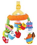 くるまやベビーカーにつけて遊べるおでかけメリー。車の窓の上の取っ手に付けてられる。ドライブ中、布製の下飾りがゆれて、メリーが楽しめる。下飾りははずして、がらがらとしても遊べる。ベビーカーのガードにも付けられる。