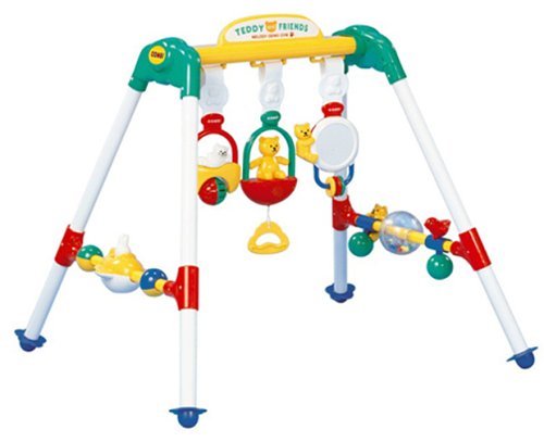 「イッツ・ア・スモールワールド」のやさしいICメロディ付ジム。下飾りは取り外してガラガラとしても遊べる。手、耳、目、五感の全てで感じとれるおもちゃ。