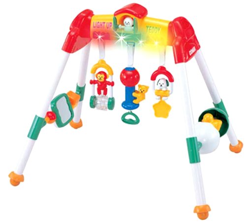 「キラキラ星」、「メリーさんのひつじ」、「オースザンナ」のICメロディ3曲付。3つの下飾りは取り外してガラガラとしても遊べる。手、耳、目、五感の全てで感じとれるおもちゃ。