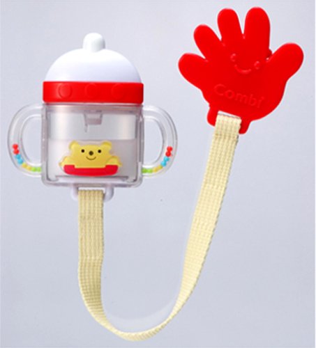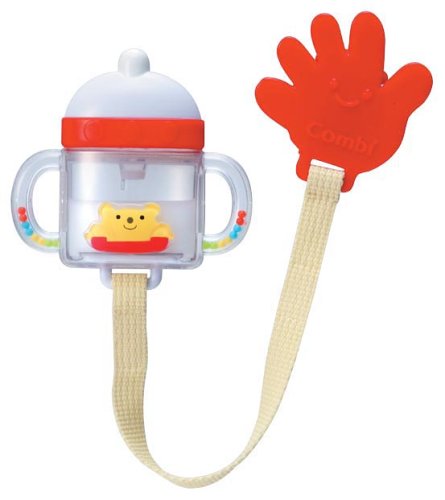 クリップつきがらがら。洋服やベビーカーにも付けられる。ミルクマグをさかさにするとあら不思議、ミルクが減っていく。乳首部分はカミカミできるやわらか素材を使用している。クリップは「おてて」の形。