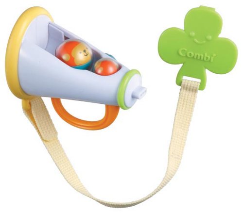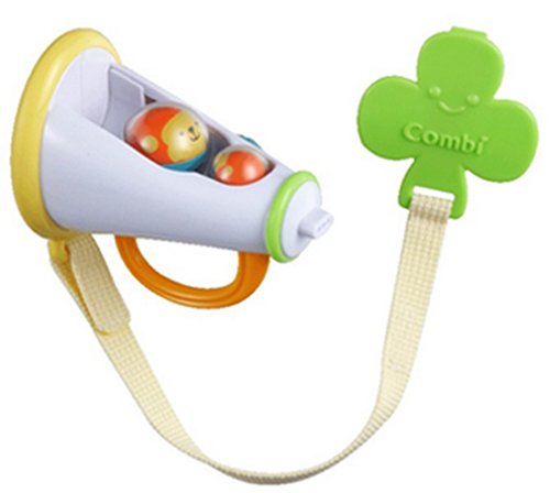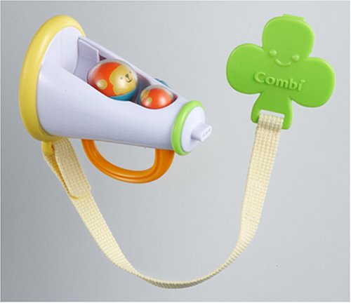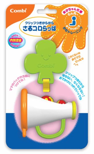 クリップつきがらがら。洋服やベビーカーにも付けられる。吹いても吸っても「プー!」と音がするさるさんのらっぱ。クリップは「クローバー」の形。