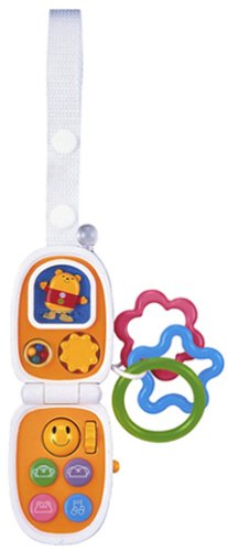 二つ折り携帯電話タイプのIC音付おでかけおもちゃ。ベビーカーやベビーベッドにも取り付けられる。カラフルなはぐるまやリングで指遊びができ、3種類の動物の鳴き声、着信音を内蔵。いつでもどこでも遊びたい赤ちゃんにぴったり。