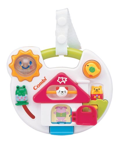 ベッドガードやベビーカーに取り付けて遊べるビジートイ。おひさまを転がすとビーズがコロコロ回り、カエルさんを動かすとカリカリ音が聞こえる。レバーを引くと「キラキラ星」が流れる。とりさんのボタンを押すとピッとわいい音がし、下にいるくまさんはひょっこり顔を出す。ボタン電池(LR-44)2個使用。