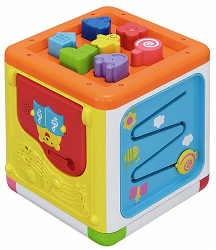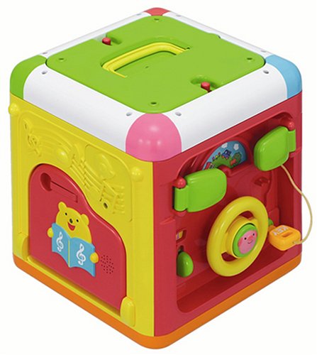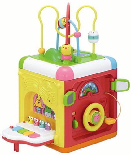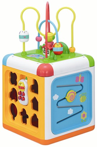 6面でさまざまな遊びができるボックス型おもちゃ。上面は、かわいいおさるさんやひよこさんのビーズ玉をループにとおして遊ぶ『玉のループ遊び』。『ドライブ遊び』、『ピアノ遊び』『ブロック遊び』『坂道コロコロ』が楽しめる。底面は7個のブロックを形にあわせて置ける『かたちあわせ』ができる。また、ループ遊びの面はひっくりかえすとフタに変身し、持ち運びができる。