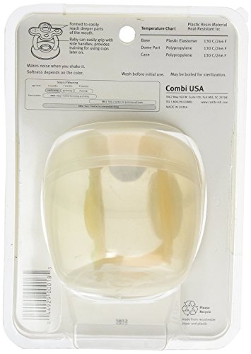 The 8 Month Teether is designed to provide stimulus to the gums and surrounding molars which promotes the transition from nursing to chewing and drinking from a cup. The teether is designed to reach deeper parts of the mouth. It makes noise when shaken and with side handles, it's easy to hold. The teether is BPA free and dishwasher safe. A sterile case is included. For 8 months and up.