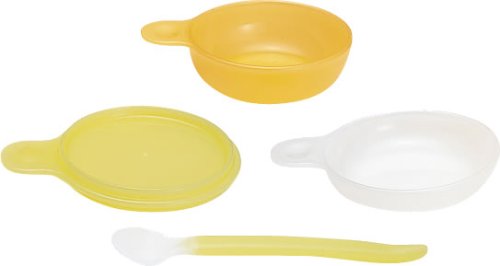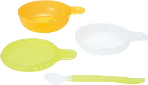 ・すり皿・小皿・電子レンジ用フタ:離乳食に最適なサイズで、すくいやすい小皿と電子レンジでのあたために便利なフタ、すりつぶしやすい突起付きすり皿の3点セット。